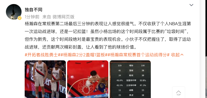 杨瀚森在常规赛第二场最后三分球钟的表现让人感觉很提气。不仅收获了个人NBA生涯第一次运动战进球,还是一记灌篮!虽然小杨出场的这个时间段属于竞赛的“垃圾时间”,但作为新队员,这个时间段绝对是最宝贵的表现机会。小伙子不仅把握住了,取得了运动战进球,还贡献两次精彩封盖,让人看到了他的比赛场价值。