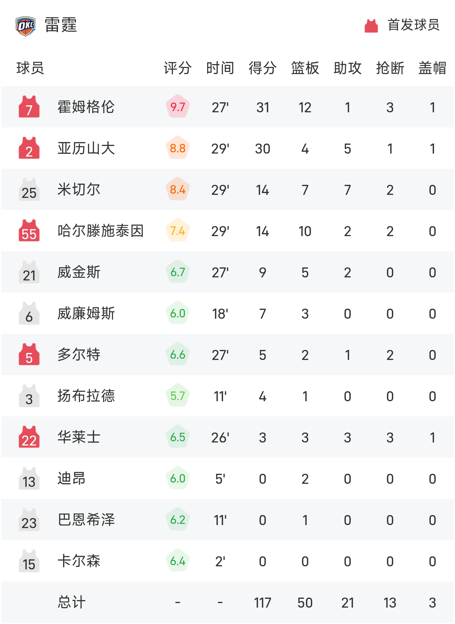 霍姆格伦砍下全场最高的31分12板1助,率领雷霆胜利取胜。
