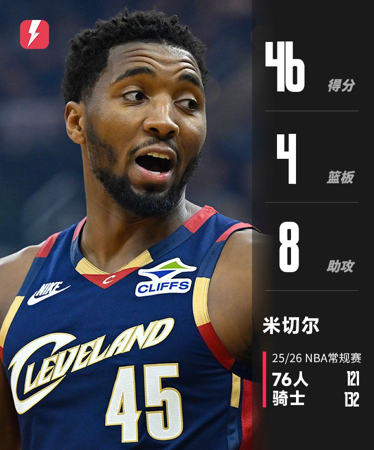 竞技状态火热!骑士球星米切尔狂砍46分8助攻,得分赛季新高!