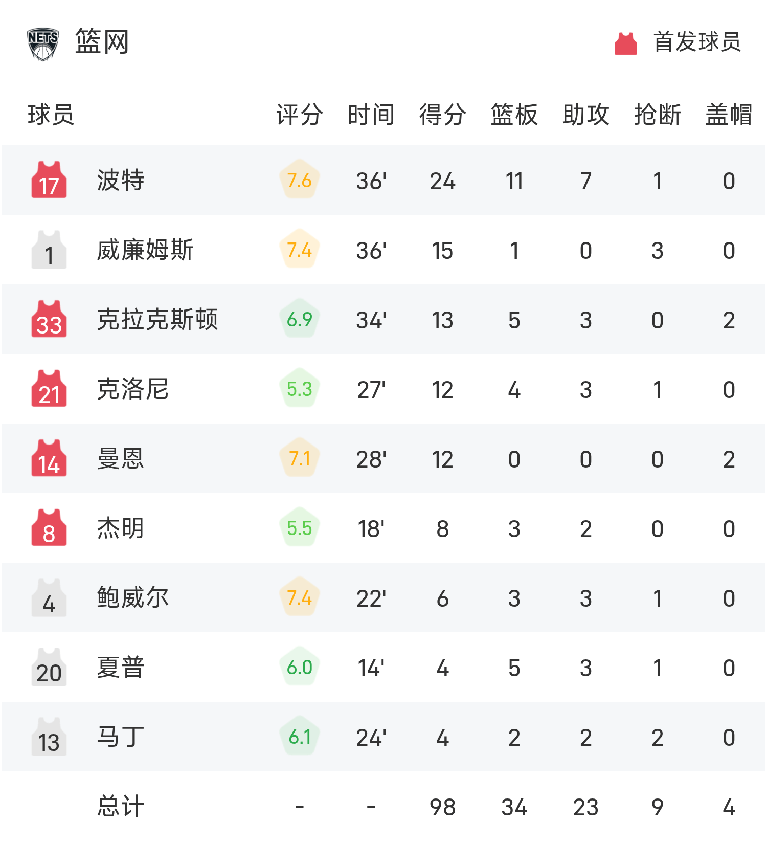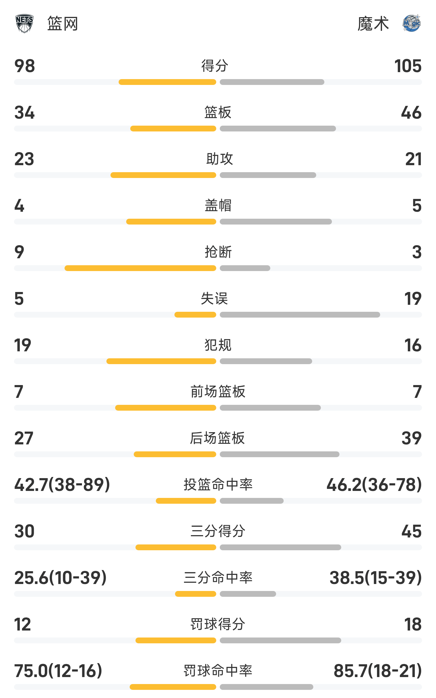 双方全场战罢,魔术105-98战胜篮网。