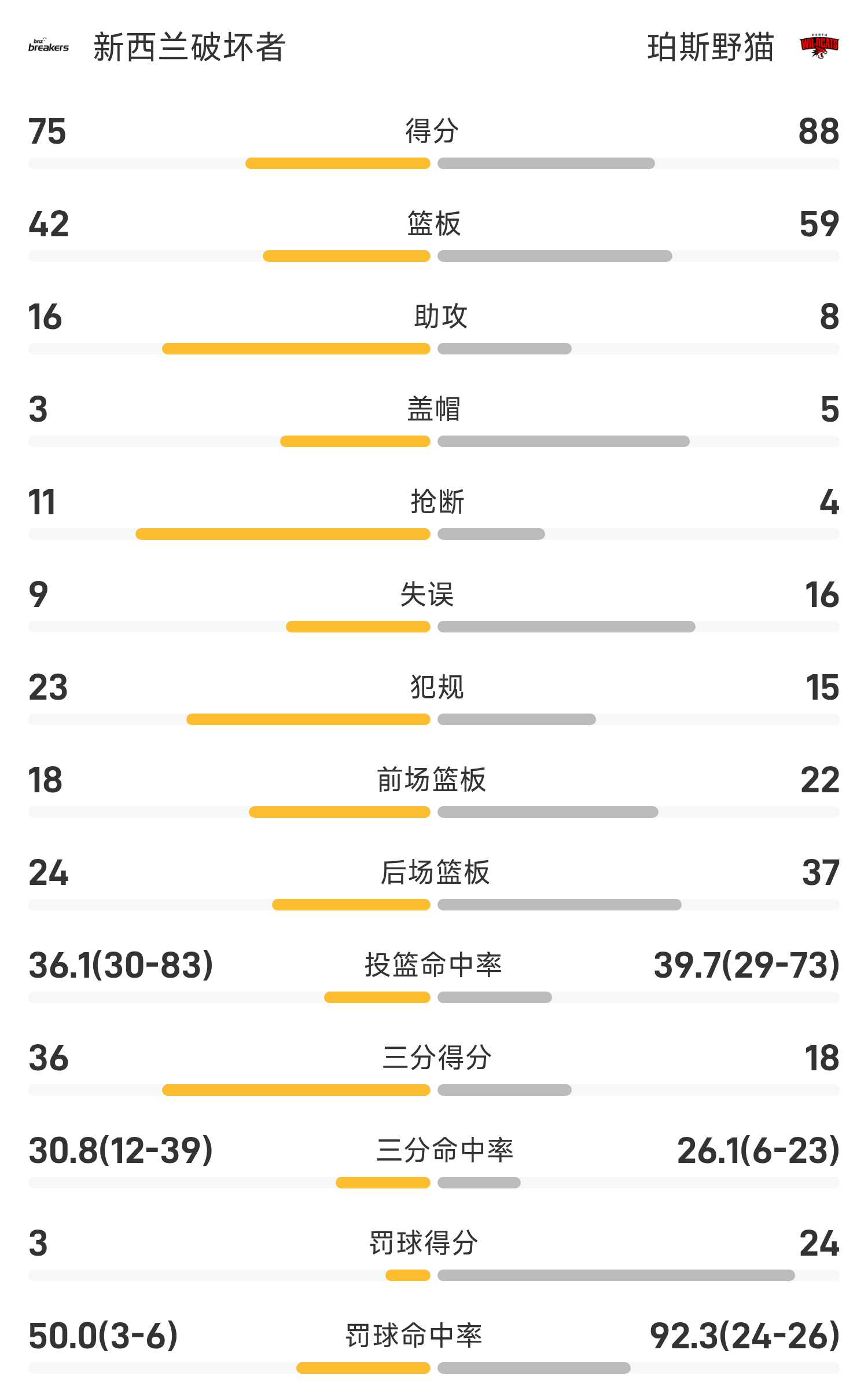 6686体育平台11月15日讯 25/26赛季NBL 常规赛,珀斯野猫对阵新西兰毁坏者。双方全场战罢,珀斯野猫88-75战胜新西兰毁坏者。杜利特砍下全场最高的24分14板2助,率领珀斯野猫胜利取胜。