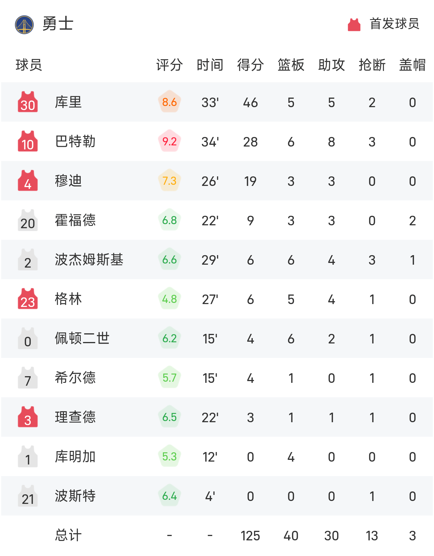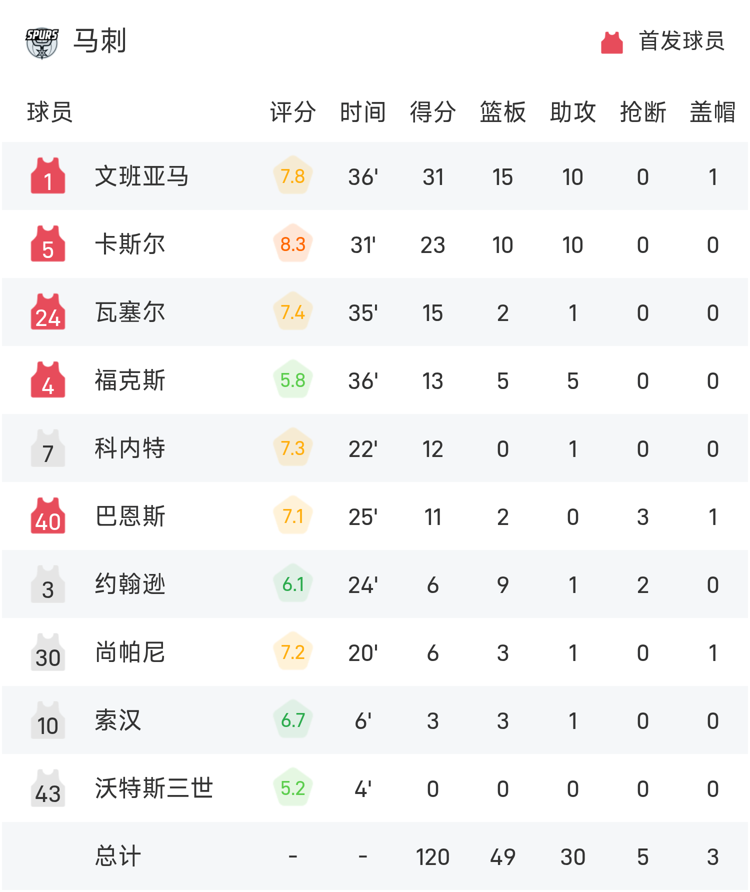 NBA战报:库里46分,文班空砍三双,勇士125-120马刺