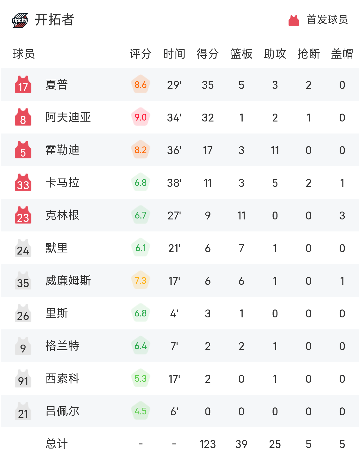 6686体育平台11月13日讯 25/26赛季NBA 常规赛,鹈鹕对阵开拓者。双方全场战罢,鹈鹕117-125不敌开拓者。夏普砍下全场最高的35分5板3助,率领开拓者胜利取胜。