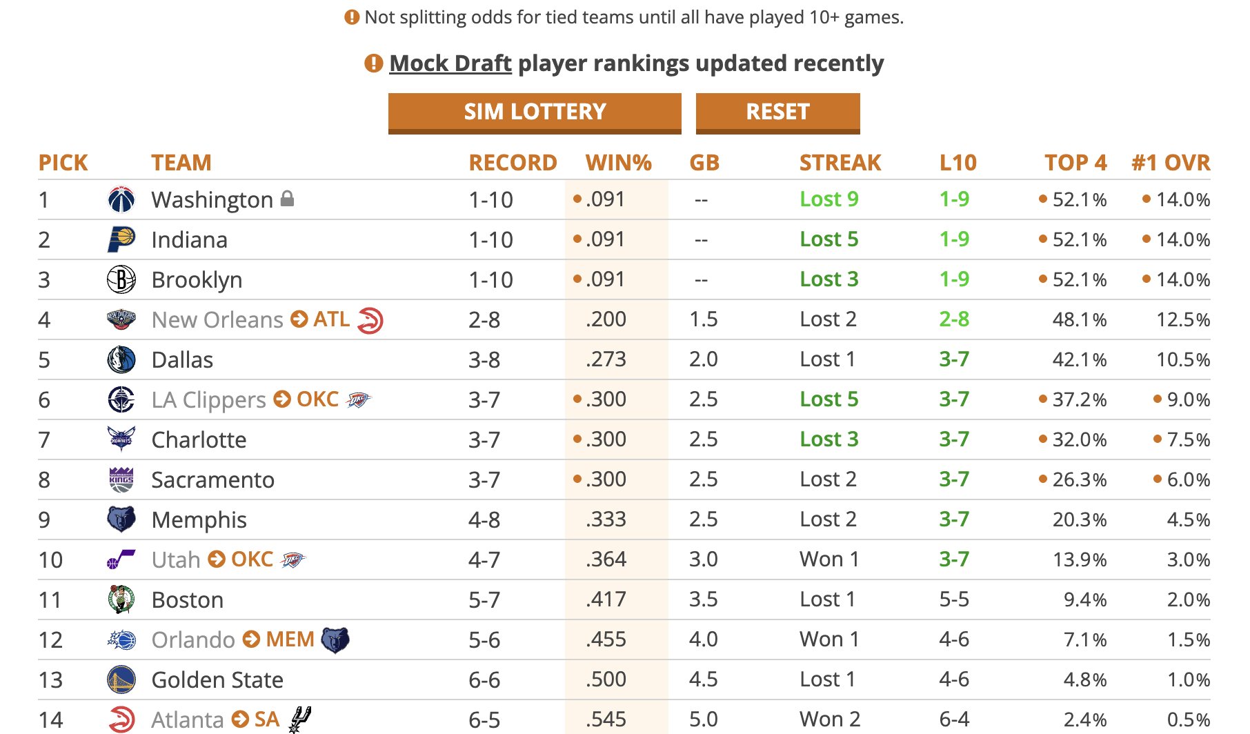 6686体育平台11月12日讯 美媒Tankathon根据当前联盟各队的战绩,今日更新了2026年选秀抽签的概率,奇才、步行者、篮网三队由于战绩都是1胜10负,抽到状元签的概率都是14%,抽到前四顺位的概率为52.1%。