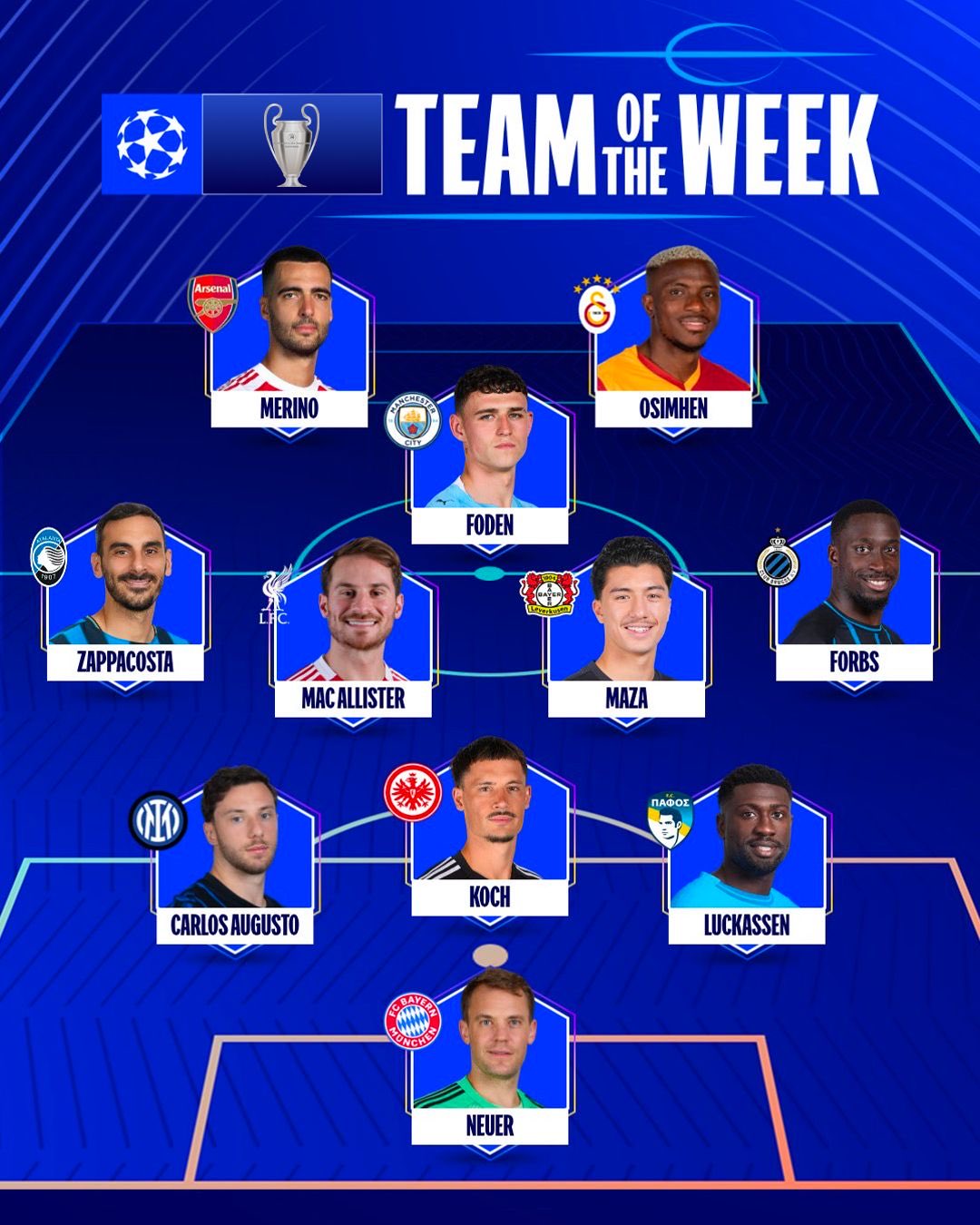 欧冠第四轮最佳阵容:诺伊尔、奥斯梅恩领衔,福登、麦卡在列