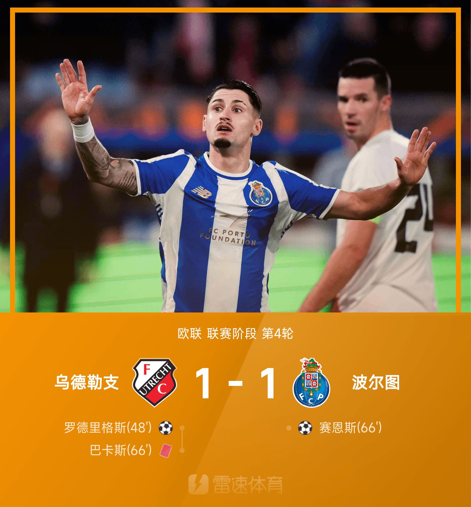 欧联战报:赛恩斯建功扳平,波尔图1-1平十人乌德勒支