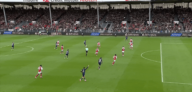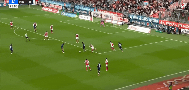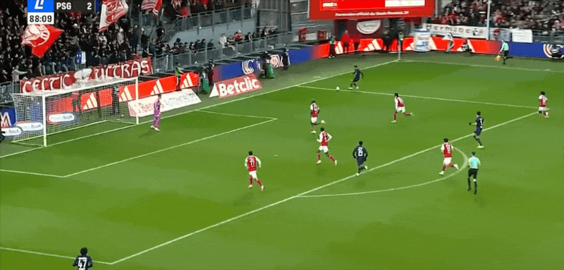 87’布雷斯特前场反击,巴尔德单刀机会失去平衡打门被扑