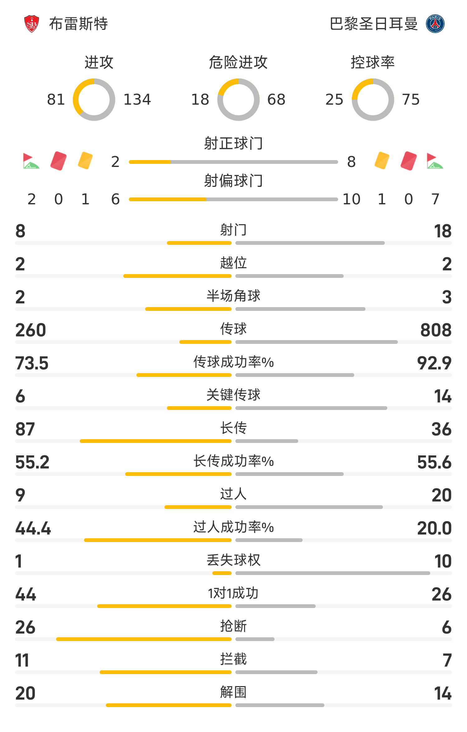9’布雷斯特前场边线球开出,后点拉拉凌空抽射攻门直飞看台