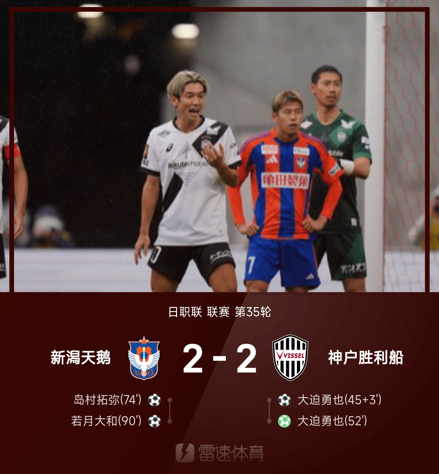 日职联战报:若月大和后备队员救主,新潟2-2逼平神户