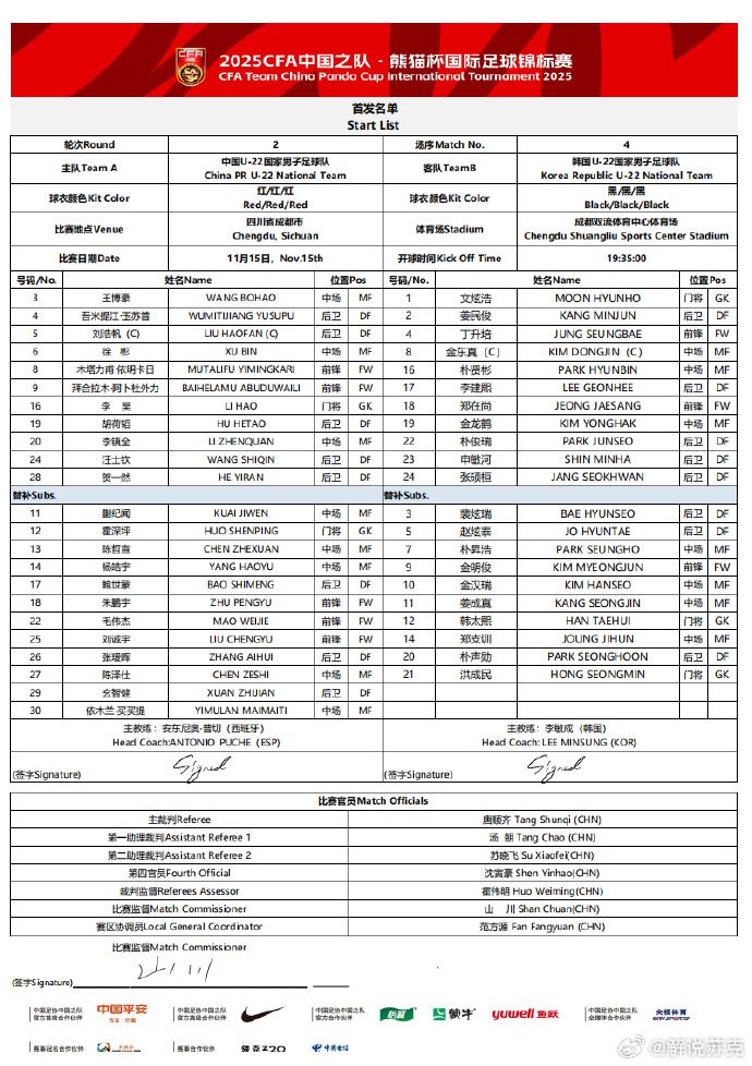 6686体育平台11月15日讯 北京时间今日,熊猫杯第二轮,国足U22对阵韩国U22,赛前双方公布首发。