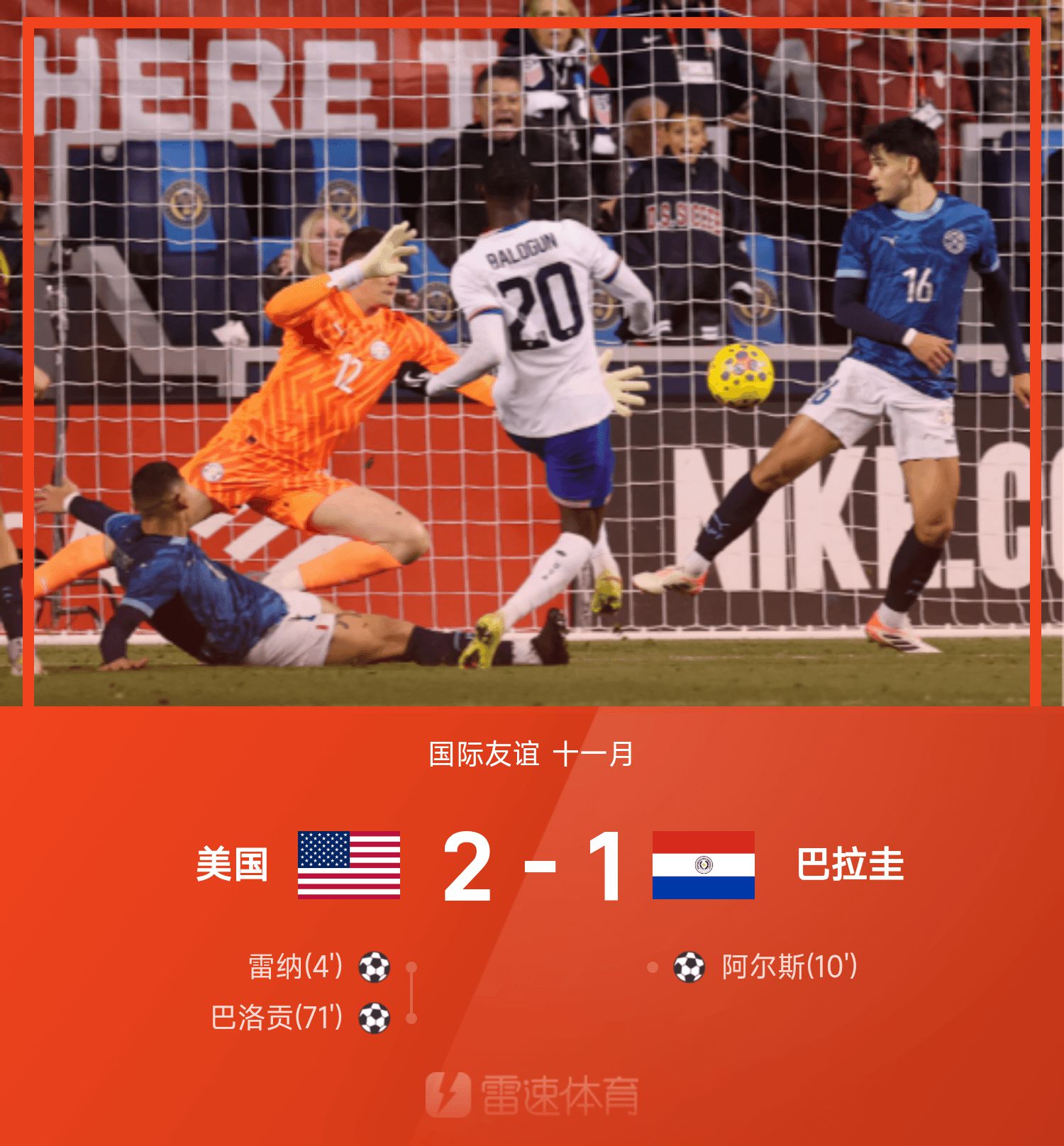 6686体育平台11月16日讯 国际友谊赛迎来一场对决,美国主队场对阵巴拉圭。美国队方面,巴洛贡、雷纳分别破门建功,而巴拉圭方面阿尔斯破门难救主,最终美国2-1击败巴拉圭。