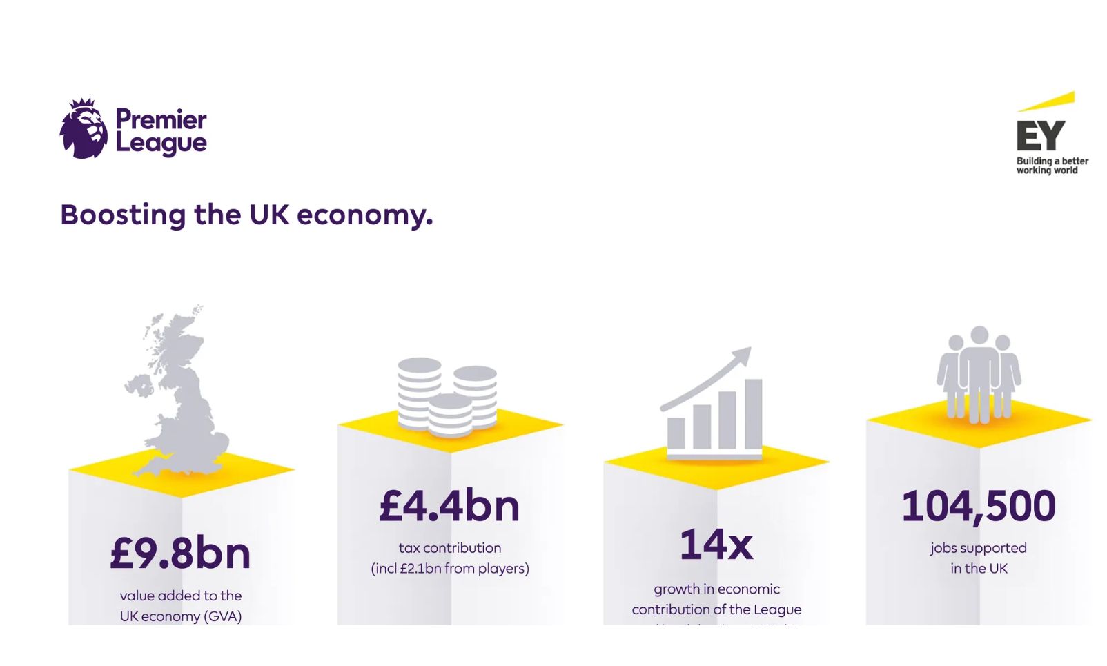 安永会计师事务所对2023/24赛季的评估显示,英超联赛事及其俱乐部为英国经济创新了98亿英镑的附加值。比2021/22赛季增长了21%,比1998/99赛季高出14倍以上。该钻研还发现,英超联赛事支持了超过10万个全职工作岗位,并贡献了44亿英镑的税款,其中包括球员和工作人员缴纳的21亿英镑——这些收入协助资助了英国各地的公共服务。